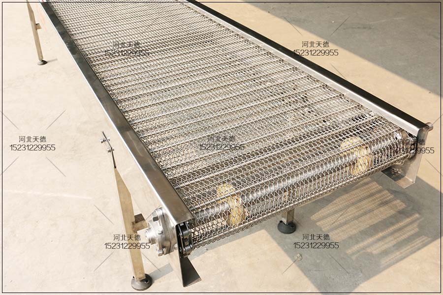 遼寧的客戶來電咨詢不銹鋼304材質網帶輸送機,客戶是要兩套同樣的規格的輸送網帶輸送機,一條不銹鋼輸送帶要求是用來清洗蔬菜,還有一條是用在烘干機上烘干蔬菜,采用的是鏈條式不銹鋼輸送帶。 兩條輸送網帶的總寬度是一樣的,都是560毫米的總寬度,其中的一套需要我們廠家做好不銹鋼輸送機把網帶安裝在輸送機上,另外一套是只定制鏈條輸送帶,客戶需要自己更換烘干機上的輸送帶。我們一般說的總寬度指的是輸送帶的滿外寬, 如果是更換不銹鋼網帶的情況,準確的方法是測量鏈輪的中間距離,這樣測量是偏差比較小的一種測量方式,天德公司的輸送機機架采用的是鋼板折彎機架,材質可以是不銹鋼材質也可以是碳鋼烤漆的,高度是300mm折彎是60mm再向里面折30mm的一個邊.客戶定制的輸送機長度是6米,輸送網帶的長度就是12米,輸送網帶的網孔做的比較大是15*25mm的,絲徑用的是2.0mm的絲徑。客戶的蔬菜清洗機是把我們的輸送機定制回去然后自己加裝噴淋裝置,不銹鋼網帶上還要加裝高4公分厚1mm的擋邊來防止有些體積小的蔬菜從鏈條網帶上掉下去。