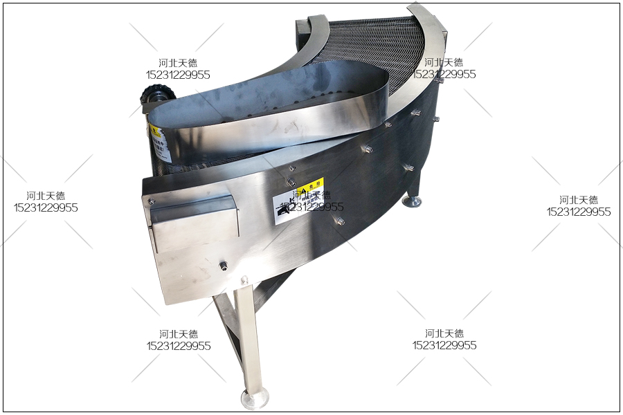 輸送形式為鏈條式金屬網(wǎng)帶,結(jié)構(gòu)形式為轉(zhuǎn)彎形式,轉(zhuǎn)彎角度為100度左右,機身采用2.5不銹鋼折彎加工,輸送機腿能夠進行上下30公分的調(diào)節(jié),輸送機寬度400毫米,鏈條金屬網(wǎng)帶寬度為350毫米,采用1.2毫米的不銹鋼絲壓彎串接而成的,使用的是U型轉(zhuǎn)彎鏈條,采用6毫米的支桿鏈接。這種結(jié)構(gòu)形式的金屬網(wǎng)帶耐用性很高。是輸送行業(yè)與食品行業(yè)中不錯的選擇。
